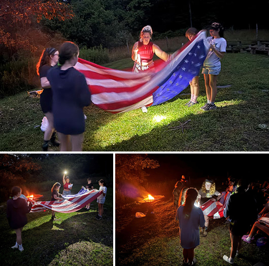A U.S. flag was retired at a closing campfire at Camp Farnsworth. The ceremony included cutting the stripes and stars and burning individually in the fire. VIEW the ceremony script.