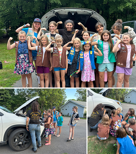 Loudon, NH, Troop 60180 had a female mechanic come by to teach the troop about cars. She was an engineering student, a robotics state champion, and also works with Girls at Work. Her passion for all things STEM really excited the girls!