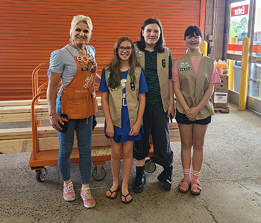 Troop 58502 Girl Scouts in Bow, NH, working on their Silver Award project of a pollinator garden, received a generous donation from The Home Depot for lumber needed for raised garden beds. The manager, CC, was very helpful and appears with Zoe Schuetz, Caleigh Epple and Elizabeth Nesbitt