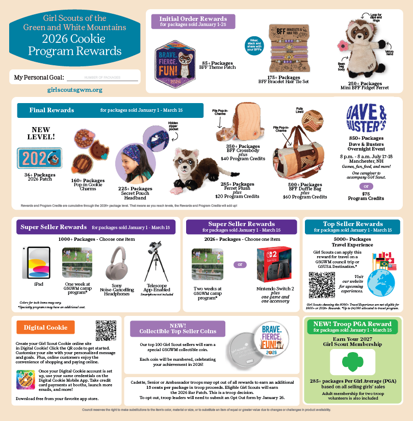 In 2025, Girl Scouts who participated in the Girl Scout Cookie program and earned rewards for selling 285 packages or more of cookies may earn Program Credits as well. Program Credits are a part of each reward level and are cumulative up to 850 packages sold. Additional Program Credits are also an option at the Super Seller level. 2025 Program Credits are valid through March 31, 2026, and can be used for a Girl Scout's membership renewal, for program fees including camp programs, at our Mountain Top Shops, or for Destinations or GSGWM travel experiences. Program Credits are valid only within our council, Green and White Mountains, and may not be used for programs in neighboring councils.