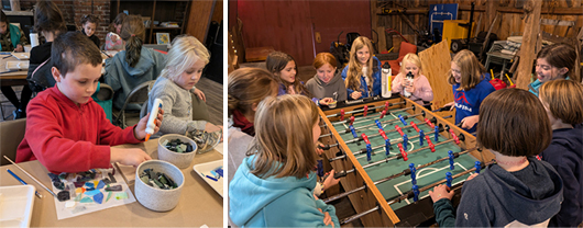 We made mosaic tile trivets at Studio 550 in Manchester in November. We started working on bat houses in November also. After the girls measured and marked the bat house pieces they played foosball.