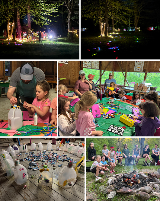 Girl Scouts gathered at Camp Twin Hills in Richmond, VT, for the council’s Enchanted Forest Overnight May 16-17. There were weather-related challenges, so activities were adapted and the campers made fairy houses out of recycled water jugs, paper lanterns, and fairy bracelets. They also played games, sang songs, had a campfire with s’mores, and were able to enjoy a campfire breakfast. At the end of the evening they walked through the enchanted camp to get back to their cabins for bed with fairy lights glowing!