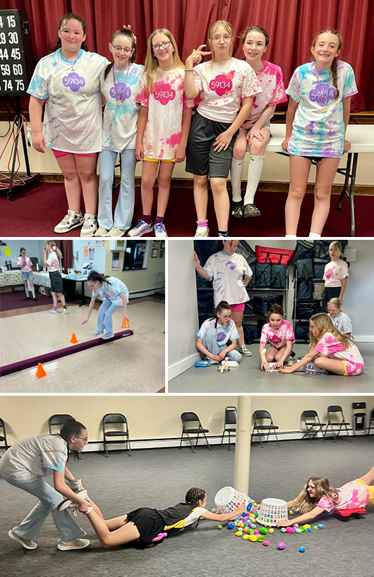Troop 59134 of Plaistow, NH, worked on their Field Day badge. They tie-dyed uniforms to start - team pink and team blue. Although it rained that day, they made the most of it indoors. Their fun in fiction was Hungry, Hungry Hippos ( so much fun) game. Their historical game was a Nerf gun target competition. Their scientific game was constructing catapults to see who could shoot Peeps the furthest, and the grand finale was a pentathlon obstacle course.