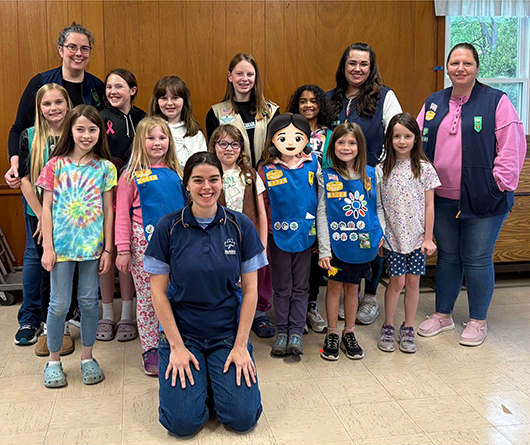 Troop 51726 of Manchester Center, VT, hosted a Girl Guide leader (Annalise, front) from Australia. The girls enjoyed sharing their Girl Scout traditions, uniforms, and songs, and asked many questions about Australia and being a Girl Guide. They exchanged SWAPs, and they even tried Vegemite! Some of the troop members remembered the Nutbush dance that they learned during troop camping from the Australian counselor last summer. Fun was had by all, and they plan on continuing the relationship by being international pen pals.