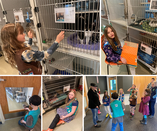 Plymouth, NH, Troop 62526 went to the NH Humane Society in Laconia and delivered Girl Scout dog treats which the girls made, cat scratcher boxes made from cookie cases, old blankets and towels (a collection combined through donations of the Plymouth Congregational Church), toys, other pet food supplies and several boxes of Girl Scout cookies and candy. The girls got to meet some dogs and read to the cats as well as had a full tour of the facility. The girls were working on a Take Action project for a Journey as well as finishing requirements for Daisy’s Animal Observer, the Brownie’s Pets, and Junior’s Animal Habitat badges.