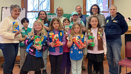 Plymouth, NH, Troop 62526 delivered donated Girl Scout Cookies to a number of hometown heroes in their area. In the past month they delivered over 36 cases of cookies. Five of those cases came from a donation made by Plymouth Rotary especially for first responders.