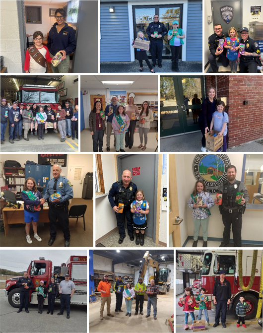 Girls delivered to the fire and police departments of Plymouth, Rumney, Campton, Thornton, Groton, and Ashland. From the cookie booth extras they also delivered cookies to the National Guard Armory in Plymouth, The Circle Camp (Girls camp in Hebron for at-risk girls), Pease Public Library (Plymouth) librarians, teachers at Plymouth Elementary, Plymouth Regional High School, Campton Elementary and Mountain College School as well as the public works departments of Plymouth and Campton, Plymouth highway/public works, National Guard, Campton Highway, Campton Elementary School, Thornton police and fire, Ashland fire, and Waterville police/fire.